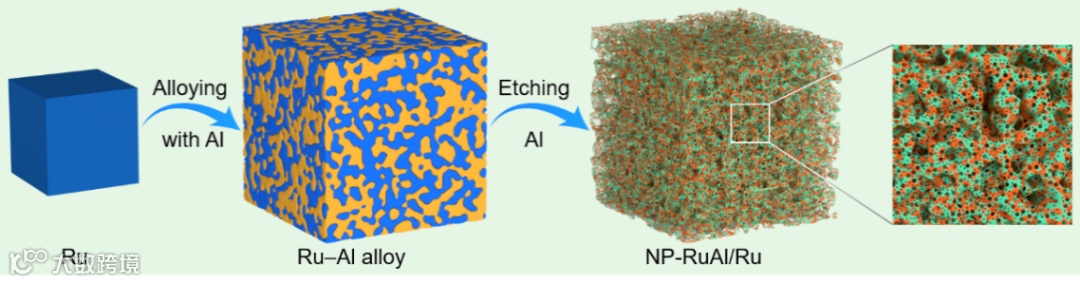 图1. 多级纳米多孔RuAl/Ru异质结的制备过程示意图。