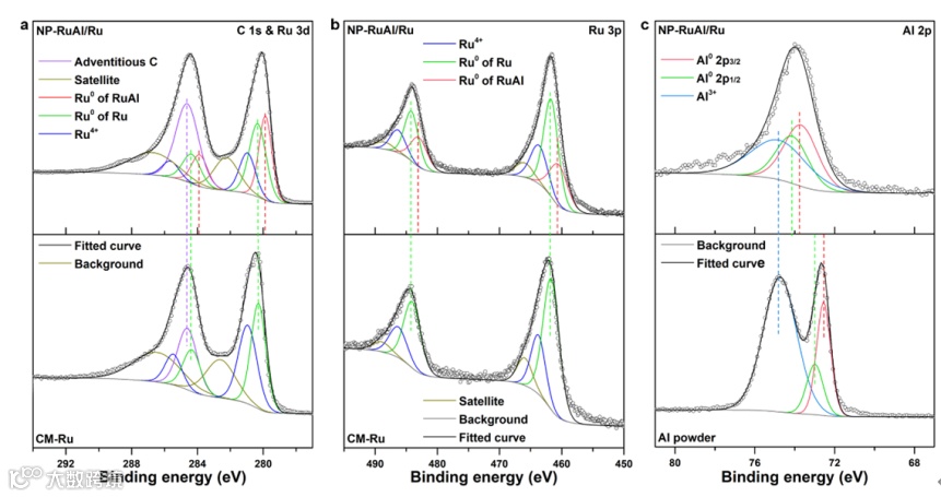 接下来,作者利用XPS研究了NP-RuAl/Ru中Ru和Al的价态信息。测试表明,NP-RuAl/Ru中Ru主要以金属态存在。相较于钌粉,NP-RuAl/Ru的Ru 3d和Ru 3p谱均在低结合能位置存在一对明显低于单质钌结合能的峰,可以指征为金属间化合物RuAl中与Al键合的Ru。此外,NP-RuAl/Ru的Al 2p谱RuAl中与单质Al相关的峰位相较于Al粉Al 2p谱中相应的峰发生明显正移。NP-RuAl/Ru中Ru和Al上述结合能变化表明电荷由Al向Ru转移,赋予Ru高电负性。