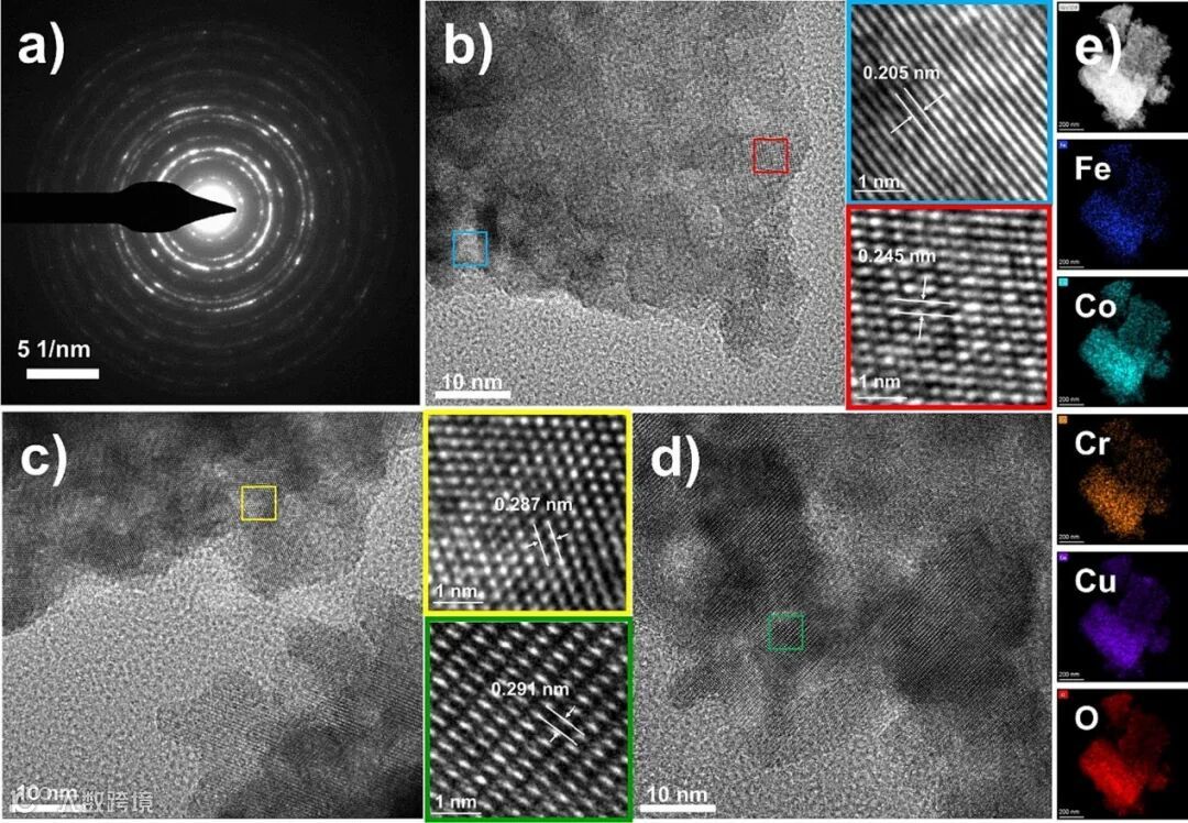 图2 Pre-FeCoCrCuOx@CF: a) SAED. b)-d) HRTEM图像。e) HAADF-STEM 图像以及相应的元素分布(Fe, Co, Cr, Cu和O)