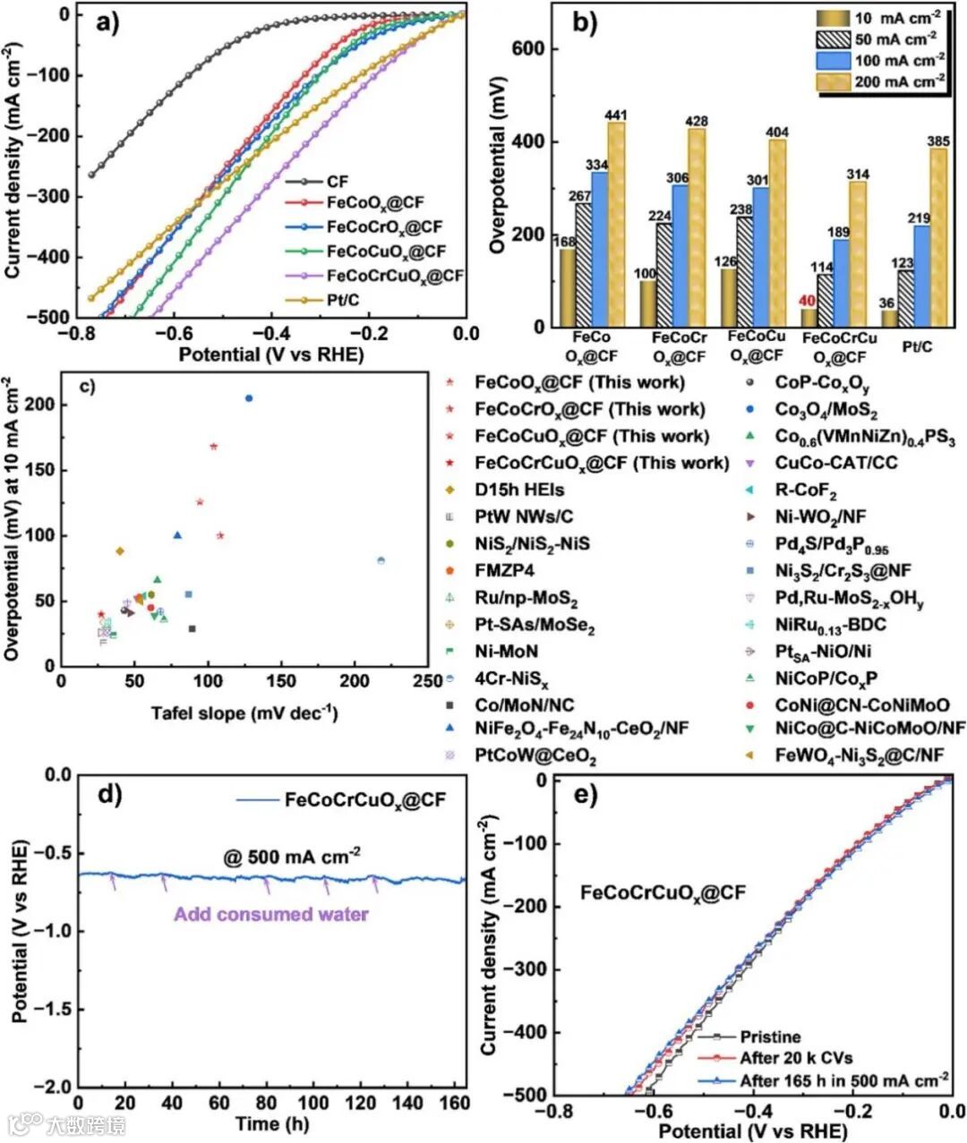 图3. 样品在1 M KOH中的析氢性能:a)LSV曲线;b) 过电势。c) 在-10 mA cm-2下,FeCoCrCuOx@CF与已发表催化剂的性能对比图。d) 在1 M KOH,500 mA cm-2下的计时电位测试。e) FeCoCrCuOx@CF稳定性测试前后的极化曲线。