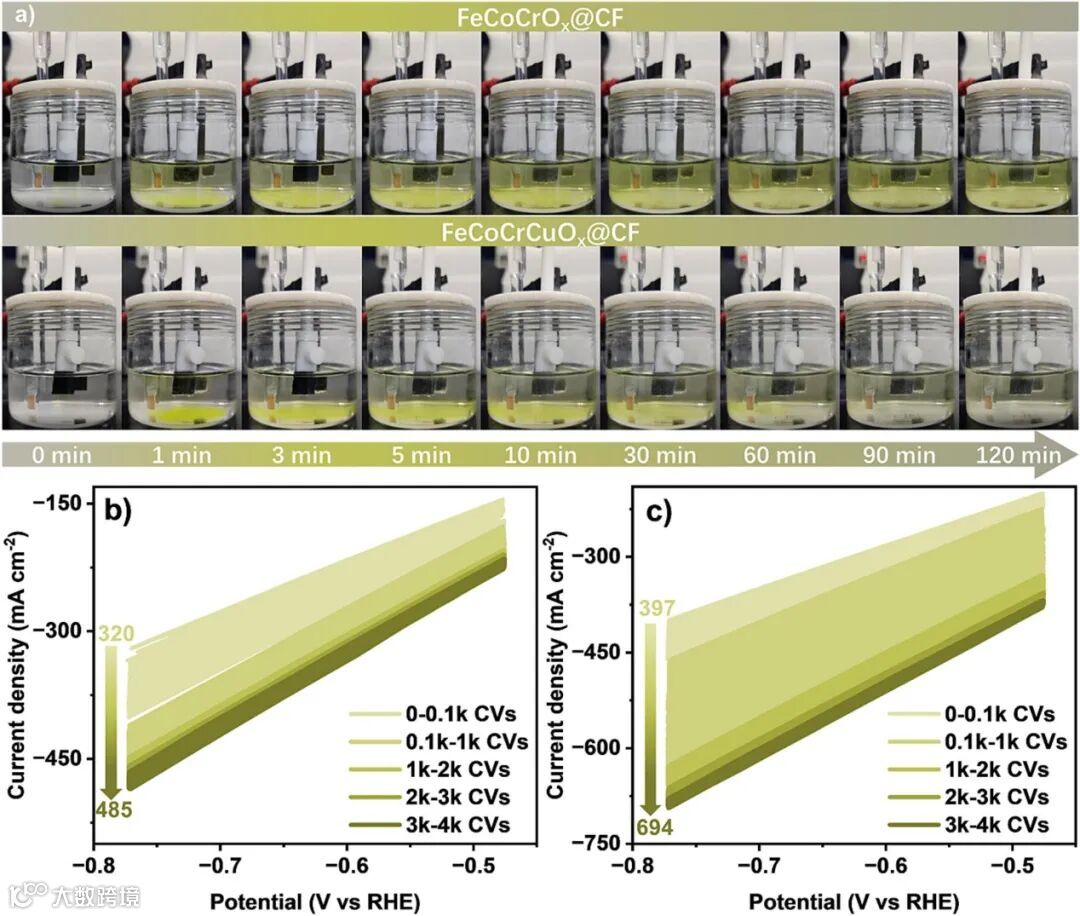 图4 a) 活化过程中不同时间的电解质图片。CV活化曲线:b) FeCoCrOx@CF和c) FeCoCrCuOx@CF。