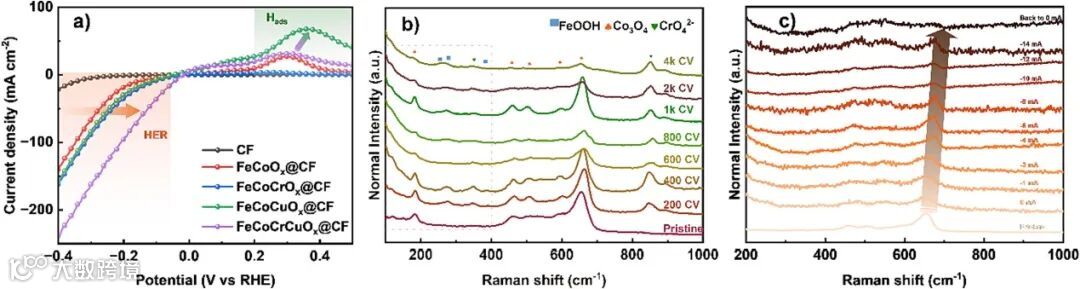 图5. a) CV 活化后在1 M KOH中不同催化剂的LSV曲线(扫描速度为0.5 mV s-1)比较。b) Pre-FeCoCrCuOx@CF在CV活化过程的准原位拉曼光谱。c) FeCoCrCuOx@CF在不同电流下的原位拉曼光谱。