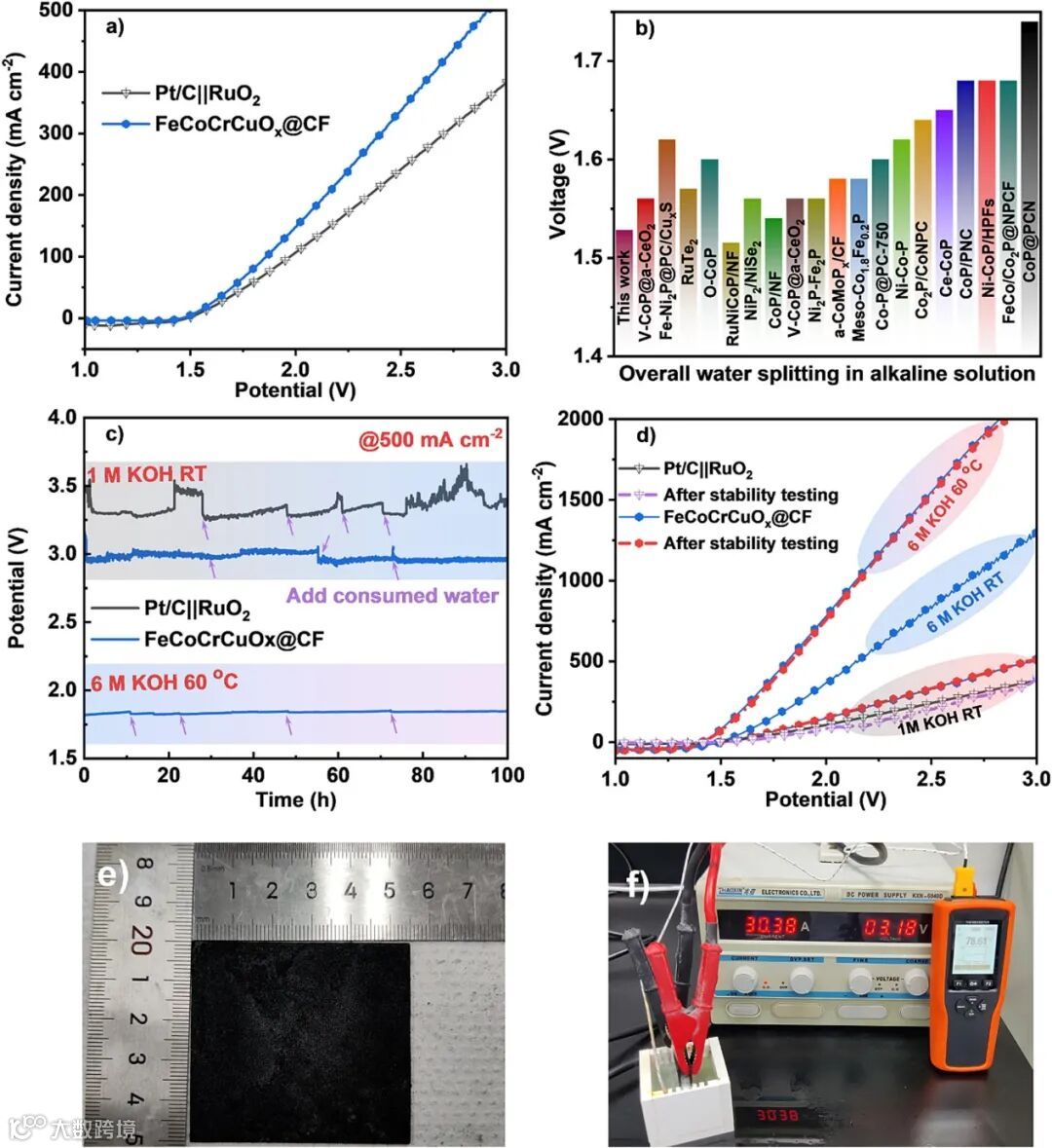 图6 a) 双功能FeCoCrCuOx@CF电催化剂的极化曲线。b) 电催化剂在10 mA cm-2的全解水电压比较。c) 500 mA cm-2 下在1 M KOH (RT)和6M KOH(60 oC)中催化剂的计时电位曲线。d) 稳定性前后催化剂的极化曲线。e) 大面积5×5.5 cm的FeCoCrCuOx@CF的数码图像。f) 浸入面积为 16.5 cm2的 FeCoCrCuOx @CF 电极在模拟工业条件(6 M KOH,∼78 °C)下的全解水性能。