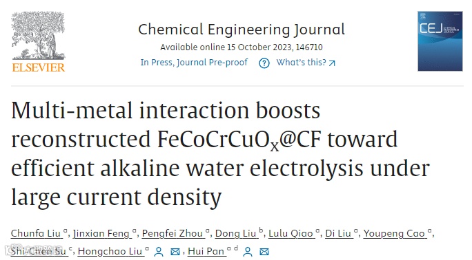 近日,来自澳门大学的潘晖教授团队在《Chem. Eng. J.》上发表题为“Multi-metal interaction boosts reconstructed FeCoCrCuOx@CF toward efficient alkaline water electrolysis under large current density”的研究文章。该论文采用了多金属原位热分解策略成功在泡沫钴(CF)上制备了Pre-FeCoCrCuOx@CF。