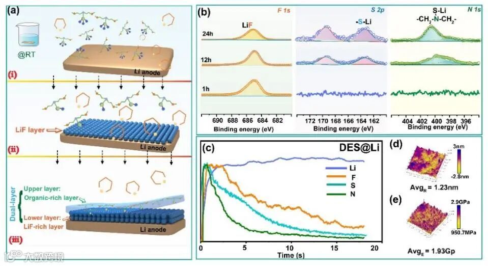 本文将锂金属浸涂在有机氟化物溶液中,通过简单的原位反应在锂金属负极表面形成富含有机组分柔性上层和富含高界面能LiF下层的双层界面层。经过设计的锂负极界面层SEI从传统的镶嵌结构调控为双层梯度结构,利用XPS、辉光放电光谱(GDOES)验证了双层结构的成功构筑。