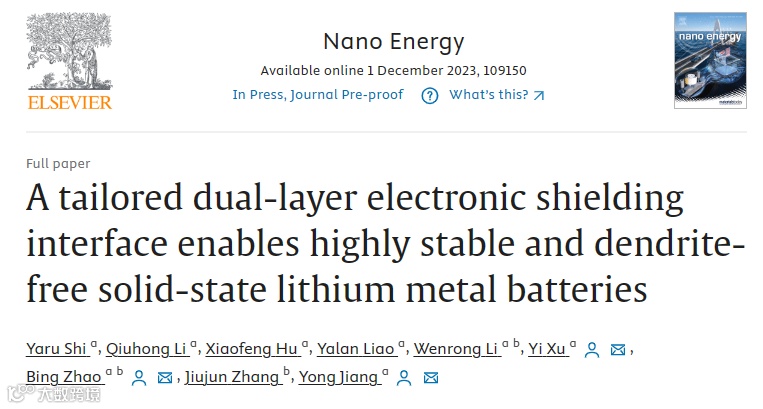 近日,上海大学蒋永研究员、徐毅副教授、赵兵研究员课题组,在国际知名期刊Nano Energy上发表题为“A tailored dual-layer electronic shielding interface enabled dendrite-free solid-state lithium metal batteries” 的研究工作。