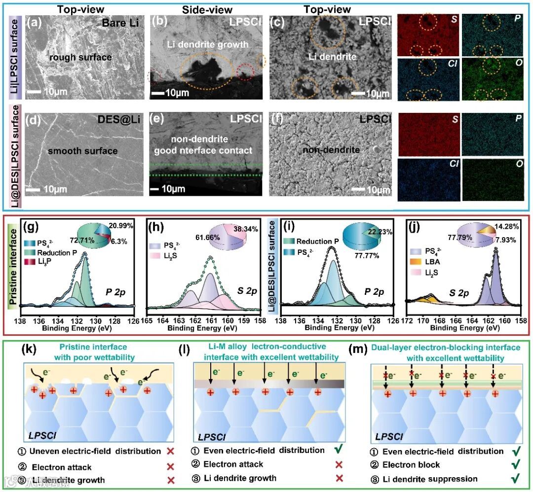 全固态锂金属电池(ASSLMB)具有高安全性、高能量密度、优异的循环寿命等优点,在能源领域受到广泛关注。硫化物固态电解质因其高离子电导率被认为是目前最有希望商用的固态电解质之一。然而,硫化物固态电解质优越的机械性能,并没有如预期那样取代液态电池解决锂枝晶生长的问题。与传统的液态锂电池相比,即使在较低的电流密度下,ASSLMB也较容易短路,多样化的宏观测试手段也印证了枝晶通过晶界和孔隙渗入固态电解质中,造成短路。科学界普遍认为,固态电解质内锂枝晶生长主要由其固有电子电导和缺陷导致。此外,当硫化物固态电解质与锂负极接触时,由于带隙不匹配,界面处会发生不可控的寄生反应。不稳定性问题使界面形成异质电阻层,从而破坏了界面对枝晶生长的耐受性。因此,在硫化物固态电解质与锂金属之间构建稳定且紧密的界面,对促进有效的离子传导、从而最大限度地减少界面电阻具有重大意义。