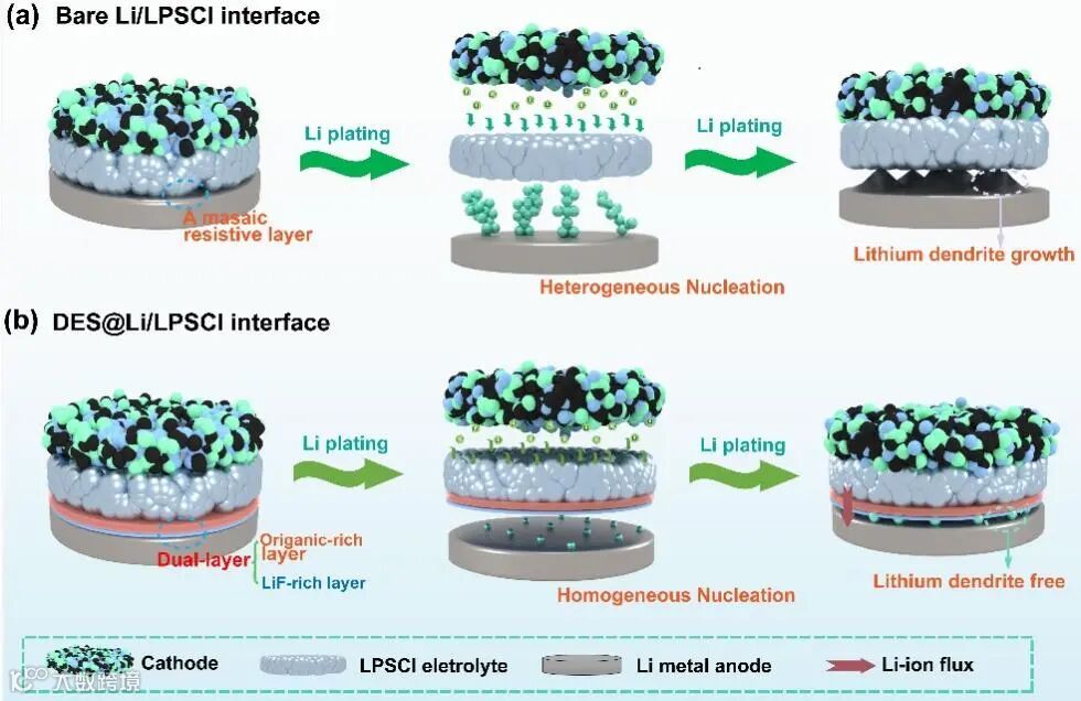 图1:(a) 传统ASSLMB和 (b) 设计的具有双层电子阻隔(DES)界面层的ASSLMB的示意图。
