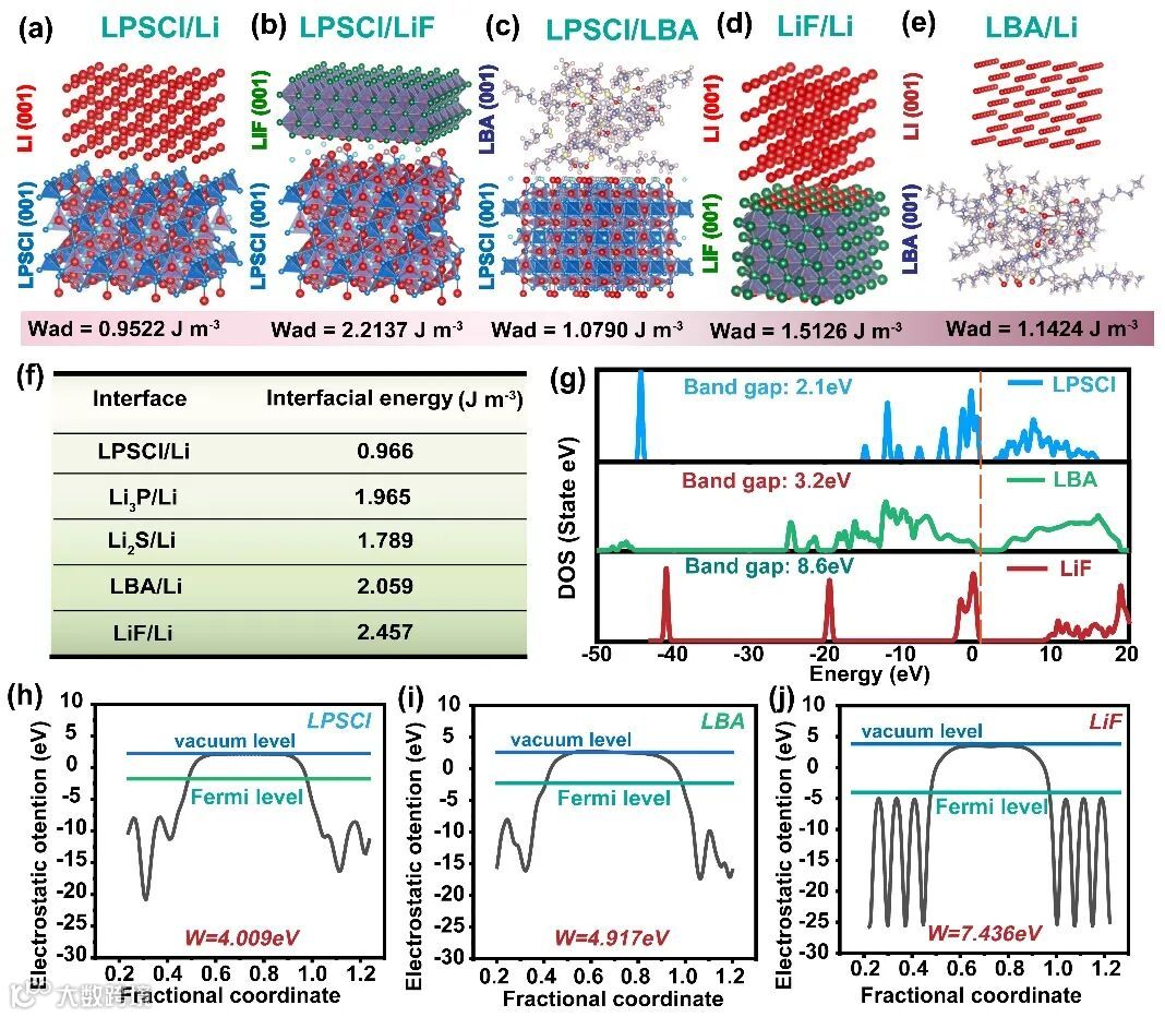 通过DFT计算揭示双层界面的优势。采用粘附功(Wad)来评估LPSCl/Li、LPSCl/LiF、LPSCl/LBA、Li/LiF和Li/LBA界面的稳定性和粘结强度。结果表明,与LPSCl相比,柔性LBA有机层和富含LiF层均能有效提高界面润湿性,促进与Li的界面相容性。同时,通过比较LPSCl/Li、Li3P/Li、Li2S/Li、LBA/Li、LiF/Li的界面能评估抑制枝晶的能力,发现LiF表现出最高的界面能(2.457 J m-3),表明下层LiF的高界面能在抑制锂枝晶生长方面发挥了关键作用。LiF作为一种优良的绝缘体(能带=8.6 eV),可以最大限度地减少电子进入硫化物电解质中。