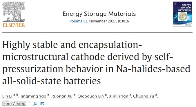 Lin Li, Jingming Yao, Ruonan Xu, Qiaoquan Lin, Xinlin Yan, Chuang Yu, Long Zhang*. Highly Stable and Encapsulation-Microstructural Cathode Derived by Self-Pressurization Behavior in Na-Halides-Based All-Solid-State Batteries, [J] Energy Storage Materials, 2023, 103016