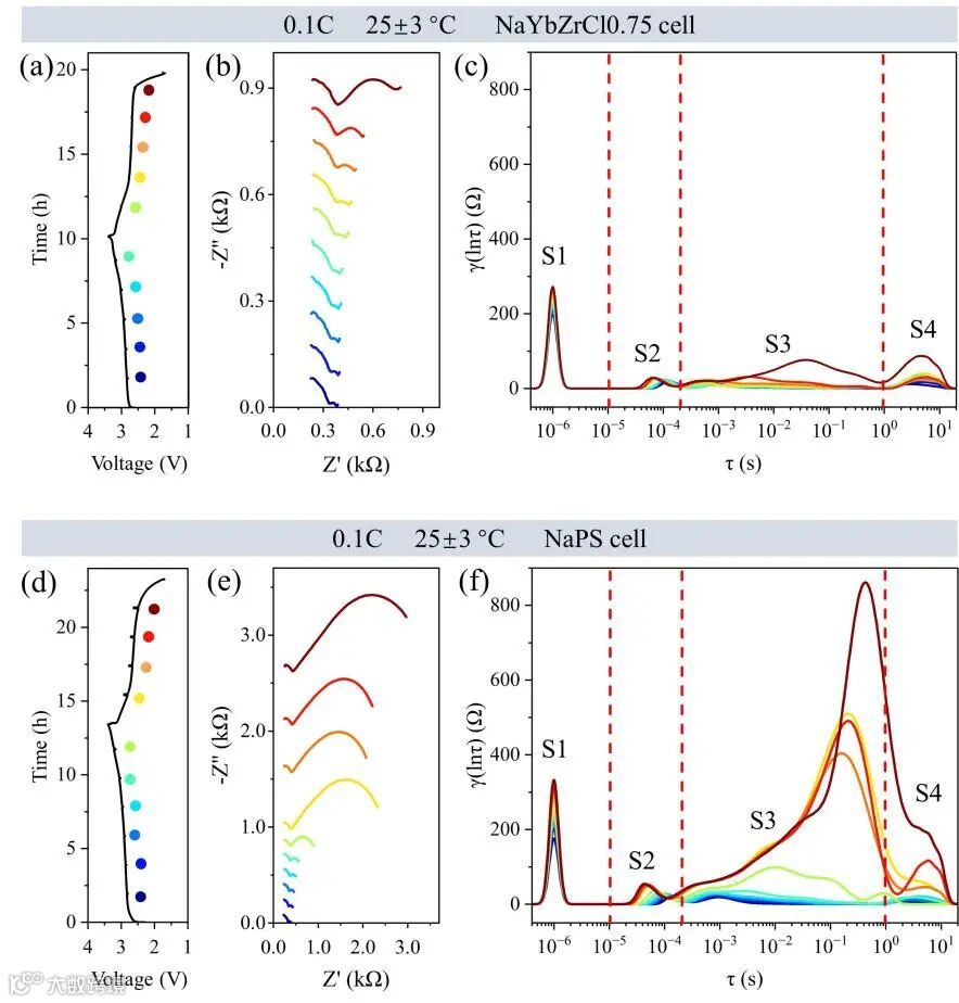 图2. NaYbZrCl0.75 (a-c)和NaPS (d-f)电池的原位阻抗分析。(a, d)时间-电压曲线。(b, e) GEIS的变化。(c, f) GEIS结果得到的DRT变换。