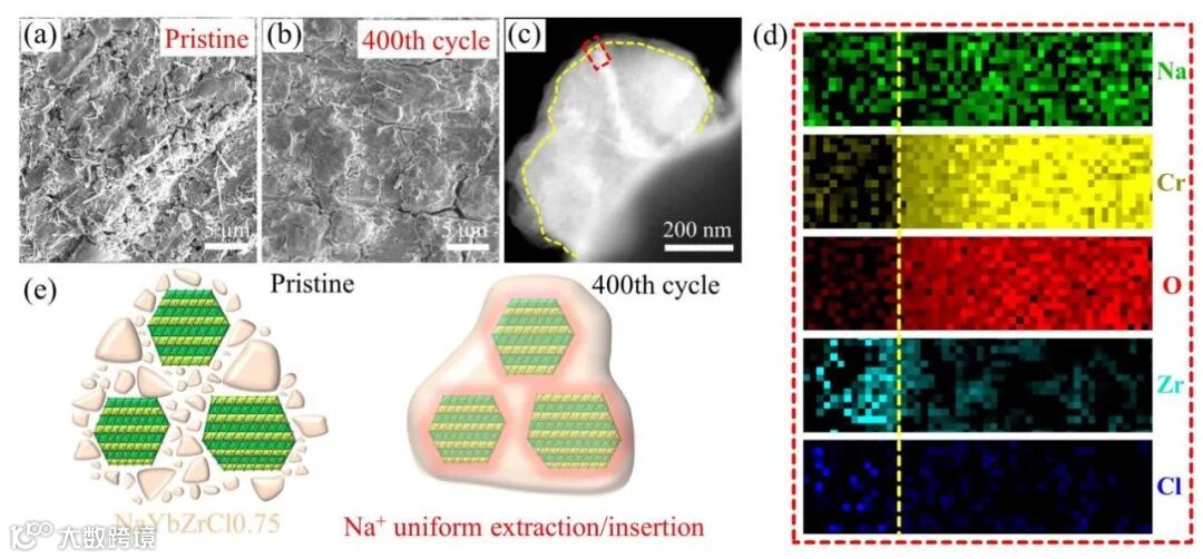 图4. 循环前后的NaYbZrCl0.75电池复合正极。(a, b) SEM图像。(c)环形暗场模型下的STEM图像,(d)选定区域的EELS映射。(e)复合正极结构变化示意图。