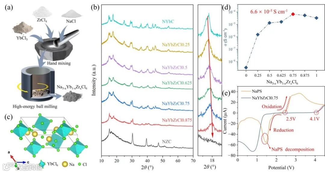 图1. (a) Na3-xYb1-xZrxCl6合成过程示意图。(b) Na3-xYb1-xZrxCl6的球磨XRD谱图。(c) NYbC的晶体结构。(d)离子电导率随Zr浓度变化关系。(e) NaYbZrCl0.75和Na3PS4电解质的循环伏安曲线。