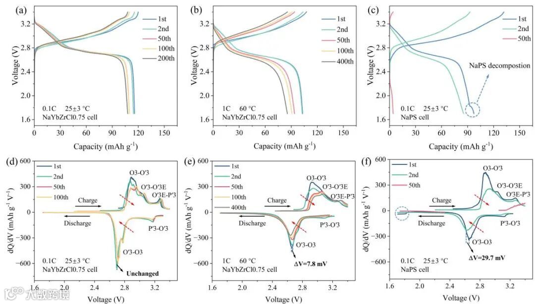 图3. (a-c)为NaYbZrCl0.75和NaPS电池在部分循环下的充放电曲线,以及相应的微分容量曲线。