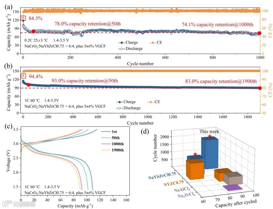 考虑到NaYbZrCl0.75与NaCrO2之间高度稳定的界面,以及电化学循环过程中形成的核壳状结构(NaYbZrCl0.75@NaCrO2),我们减少了正极中NaYbZrCl0.75添加剂的用量,以提高活性物质的质量负载(4.6 mg cm-2活性物质,8 mg复合正极)。图5a和b分别显示了在0.2C(25±3 °C)和1C(60 °C)下循环的NaYbZrCl0.75电池(复合正极中NaCrO2的重量负载为60%,电压窗为1.4-3.5 V)的循环性能。这两种电池都表现出良好的比容量和良好的循环稳定性。