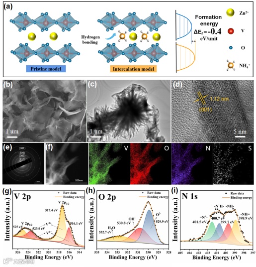 图1. (a)VO-NH阴极材料结构示意图以及形成能差异;(b)SEM图;(c)TEM图;(d)HR-TEM图;(e)SAED图;(f)EDX元素映射图;(g)V 2p; (h)O 2p; (i)N 1s的XPS价态分析。
