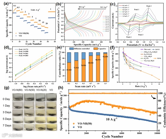 图3,(a)VO-NH的倍率性能;VO-NH(b)不同电流密度下的GCD曲线对比;(c) 不同扫描速率下的(c)CV曲线;(d) b值分析;(e)赝电容贡献的百分比; (f)VO-NH与之前报道的钒基氧化物的倍率性能对比。(g)四种材料在2M ZnSO4中浸泡一周后的物理静置溶解图比对。(h)VO和VO-NH(50)在10A g−1下的长循环性能比较。