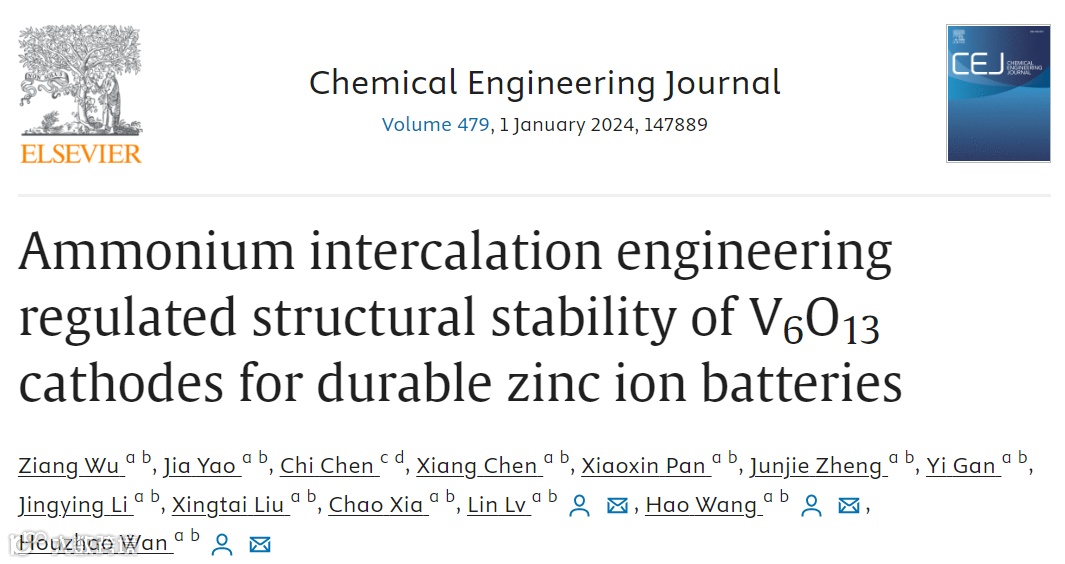 近日,来自湖北大学的万厚钊教授、王浩教授和吕琳副教授,在国际知名期刊Chemical Engineering Journal上发表题为“Ammonium intercalation engineering regulated structural stability of V6O13 cathodes for durable zinc ion batteries”的观点文章。该观点文章提出了一种铵根插层方法解决V6O13长期存在的稳定性问题。铵根的氢键作用抑制了V6O13层间V-O晶格畸变和V的溶解,降低了形成能,使结构更加稳定。