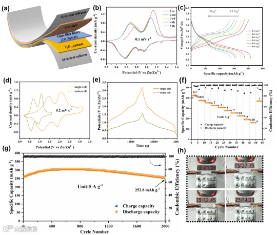 图6. (a)软软件包示意图。在1 mV s−1处的(b) CV扫描图。不同电流密度下的(c) GCD曲线。(d-e)单个电池和串联电池的CV和GCD曲线比较。(f)软包的速率性能 (g)长循环性能。(h) LED模型。