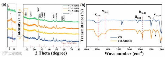 图2. VO、VO-NH(20)、VO-NH(50)和VO-NH(80)的(a)XRD图; VO和VO-NH的(b)傅里叶红外对比