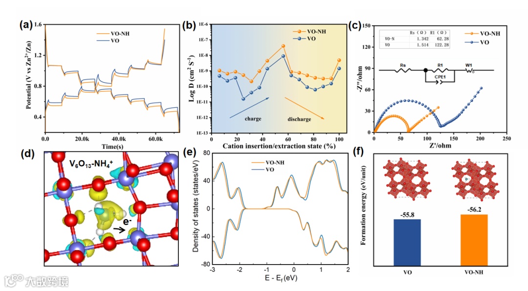 图4.VO和VO-NH动力学和DFT计算对比:第二次放电过程的(a) GITT;(b)扩散系数;(c) 初始阻抗;(d)差分电荷图和电荷转移分析;(e)态密度分析对比;(f)形成能