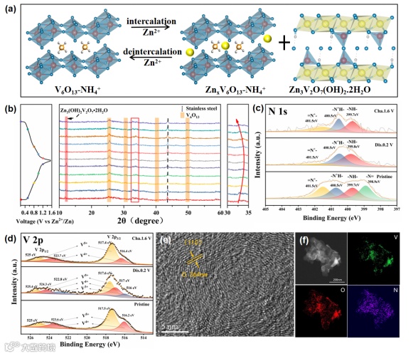 图5. VO-NH的(a)Zn2+嵌入/脱出示意图;(b)非原位XRD和相应的电压图;电池充放电平台上最高点和最低点与初始状态对应的c) N 1s;d) V 2p元素XPS光谱对比;循环2000次后的(e) HR-TEM图像和(f)EDX元素映射。