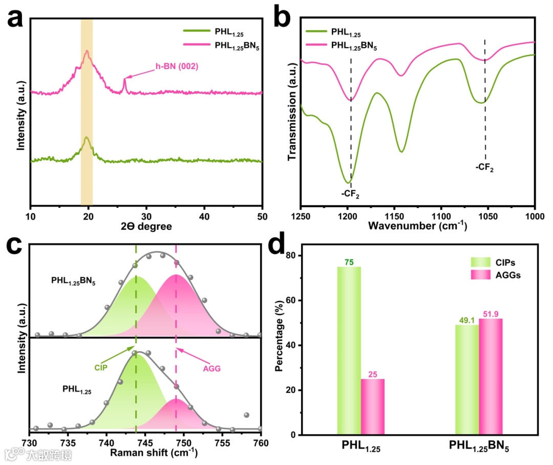 如图1所示,DFT计算表明具有强极性基团的PVDF-HFP对于BN的吸附能(-1.48 eV)高于对于Li+的吸附能(-1.14 eV),这有利于减弱锂离子在沿着链段进行运动时受到的链段作用力,固体核磁锂谱(6Li MAS NMR)也进一步揭示了BN的加入对于电解质Li+化学环境的影响。同时,如图2所示,XRD、FTIR和Raman测试也进一步表明这种相互作用的发生以及Li+化学环境的有利变化。如图2c,d所示,BN的加入引起了Li+配位环境的改变,聚集离子对(AGGs)形式的Li+配位结构由25%升高到了51.9%,表明了在电解质中形成了一条以AGGs形式存在的新的Li+传输通道。