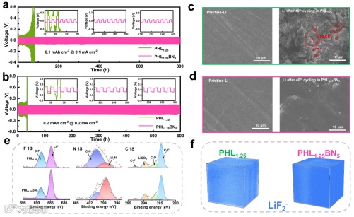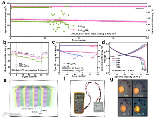 如图5所示,基于PHL1.25BN5固态电解质的Li/Li对称电池在电流密度0.2 mA cm-2、沉积容量0.2 mAh cm-2的条件下能稳定循环600 h,在电流密度0.1 mA cm-2、沉积容量0.1 mAh cm-2下则能稳定循环800 h。循环后锂金属表面的SEM图也表明了PHL1.25BN5在抑制锂枝晶生长时的优异性能。这得益于在BN作用下产生的AGG形式的Li+传输通道,在锂金属表面诱导产生富含无机组分LiF的SEI层,在加快Li+运输速率的同时有效地抑制了锂枝晶的生长。同时,如图6所示,将PHL1.25BN5应用于Li/LFP和Li/NCM523体系展现出优异的电化学性能。Li/PHL1.25BN5/LFP电池在25°C、0.5 C下可提供156 mAh g-1的高放电容量和99.7%的库伦效率。Li/PHL1.25BN5/NCM523电池的比放电容量高达140 mAh g-1,在0.5 C下循环100次后容量保持率在90%以上。而商业的液态电解液(1M LiPF6 in EC:DEC = 1:1%)则在循环50圈后容量衰减到80%。考虑到PHL1.25BN5的独特特性,可以很容易地通过内部串联而不需要外部布线来制造高压双极软包电池,从而实现高能量密度软包电池。如图6f所示,这种双极堆叠技术可以将输出电压提高到6.41 V,几乎是一个电池的两倍,同时在剪切实验中表现出优异的安全性能。这些结果很好地证明了PHL1.25BN5在固态锂金属电池中潜在的应用前景。