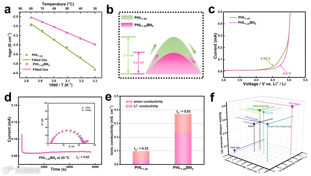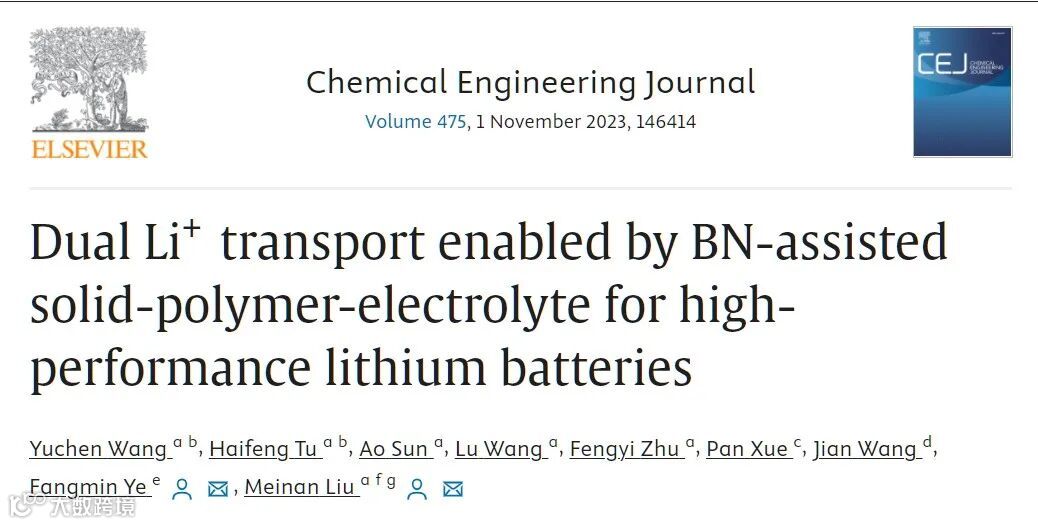 近日,来自中科院苏州纳米所刘美男以及浙江理工大学叶方敏团队在Chemical Engineering Journal上发表了题为“Dual Li+ transport enabled by BN-assisted solid-polymer-electrolyte for high-performance lithium batteries”的论文。本文报道了一种具有双Li+通道的聚合物固态电解质PVDF-HFP/LiTFSI/BN(PHL1.25BN5),利用无机填料BN(氮化硼)与聚合物PVDF-HFP(聚偏氟乙烯-六氟丙烯)中-CF基团的分子间的相互作用,不仅成功地加快了Li+沿着聚合物链段的运输,同时改变了电解质中Li+的溶剂化结构,形成了一条以聚集离子对(AGGs)形式的Li+传输通道从而加快了Li+的扩散速率。本研究结果是研究团队在前期工作中发现构筑聚离子结构能够有效提升离子在本体电解液中迁移速率(J. Mater. Chem. A, 2020, 8, 8033; Adv. Funct. Mater. 2022, 2203336; Nano Res. 2022, 1998; Chem. Eng. J. 2022, 434, 134647; Adv. Funct. Mater. 2023, 33, 2212499; Energy Storage Mater. 2023, 63, 102961)的又一突破。