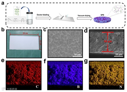 如图3所示,本文采用简单易操作地刮涂工艺,能够制备填料分布均匀且具有较大尺寸(20×10 cm)的聚合物固体电解质,所得到的固体电解质具有表面紧密相连的密实结构且厚度只有约50 μm左右。因此,如图4所示,我们所制备的聚合物固态电解质具有高的离子电导率(0.37 mS cm-1)和迁移数(0.63)以及宽的电化学窗口(4.8V)。