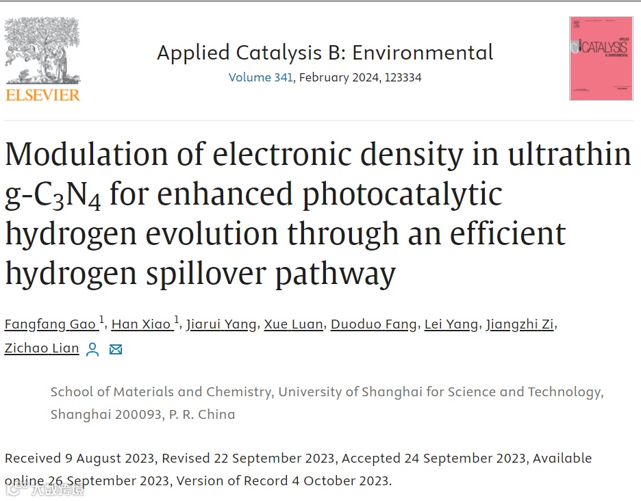 Modulation of Electronic Density in Ultrathin g-C3N4 for Enhanced Photocatalytic Hydrogen Evolution through an Efficient Hydrogen Spillover Pathway. Applied Catalysis B: Environmental 2024, 341, 123334.