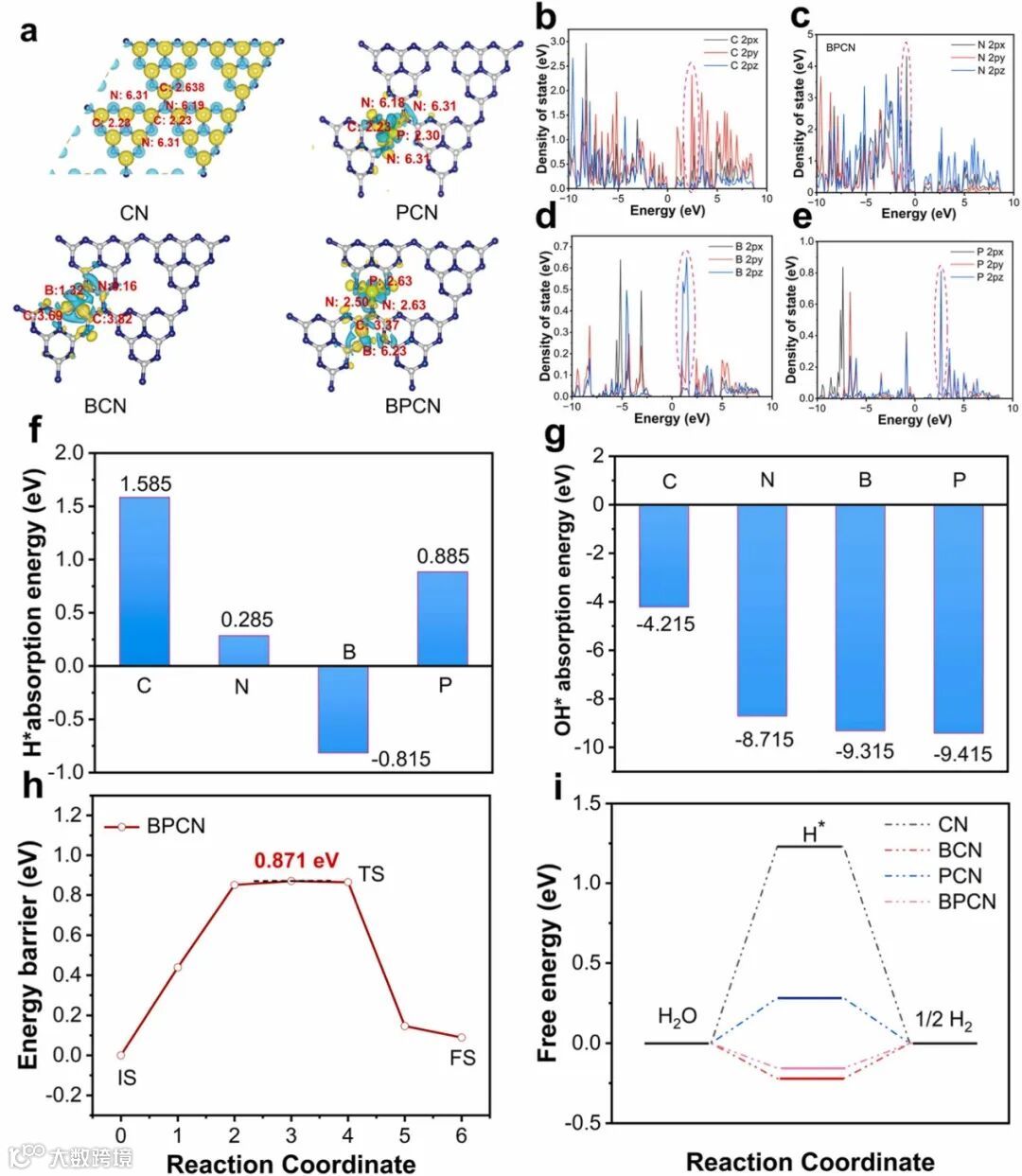 通过DFT计算,B和P的协同作用可以促进光生载流子的高效分离。根据BPCN上的吸附能和过渡态的计算,P对OH*和B对H*的强吸附是通过H2O分解发生的。氢从P位点向B位点溢出,B位点被认为是HER的活性位点。因此,BPCN在HER中的高光催化活性归因于B和P共掺杂、氢溢出过程和新的电荷转移的协同作用。