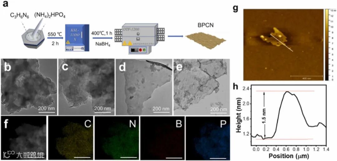 本工作通过两步热聚合法合成了缺电子B和富电子P共掺杂g-C3N4的超薄的纳米片(BPCN)。特殊的超薄纳米片结构有利于增大材料的比表面积,增加活性位点并且有助于光催化剂间载流子的快速分离和传输。
