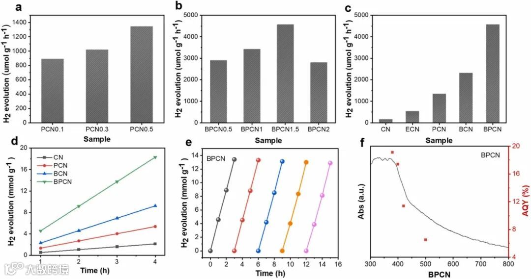 研究发现,在可见光(波长大于420 nm)照射下, BPCN在HER中的光催化活性高于BCN (2310 μmol h−1 g−1)、PCN (1346 μmol h−1 g−1)、超薄g-C3N4-ECN (538 μmol h−1 g−1)和块体CN (145 μmol h−1 g−1)。在420 nm和380 nm处,BPCN的AQY分别为11.4%和19.1%,优于大多数基于g-C3N4的催化剂。