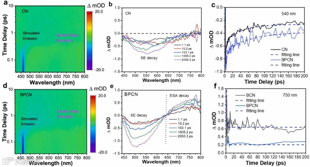 本研究结合飞秒瞬态光谱技术详细的揭示了光催化载流子动力学和电荷转移路线。发现在该研究体系中,富电子P和缺电子B在BPCN中分别充当电子供体和受体,协同促进了g-C3N4中有效的浅层电子俘获,有效抑制了光生电子与空穴的复合。该研究成果也为进一步确定光催化活性和光诱导载流子转移途径之间的关系铺平了道路。