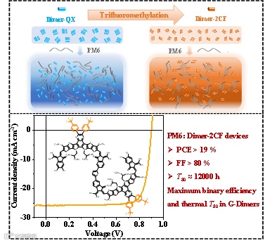 在此工作中,基于喹喔啉中心核的两个G-Dimer被成功设计和合成,三氟甲基化的影响被细致研究。研究表明,三氟甲基化减弱了G-Dimer同分子间有序堆积但显著地增强了给受体异分子间的相互作用,从而成功抑制了受体分子在成膜过程中的过度自组装进程,PM6: Dimer-2CF混合膜中形成了小相分离尺度内更有序的组装及明显的垂直相分布形貌特征,从而表现出更优异的激子动力学行为和电荷性能,最终可获得19.02%的高光电转换效率。且此工作对小分子和G-Dimer的稳定性进行了系统全面的测试,表明G-Dimer为基础的有机太阳能电池可实现更好的运行稳定性。此工作首先提出增强异分子间相互作用在G-Dimer设计中的重要性,且提出三氟甲基化的有效策略,为高效率光伏材料设计提供指导建议。