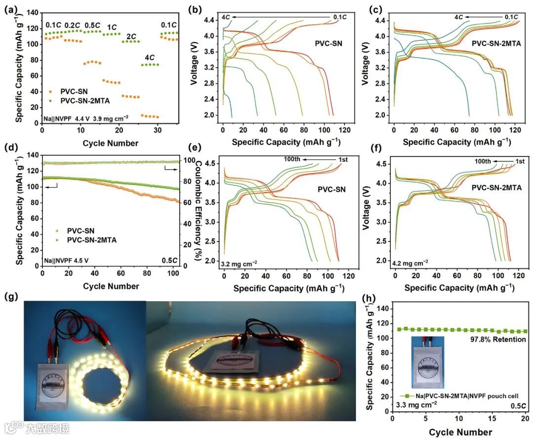 图5. 采用不同原位固化电解质的Na||NVPF电池的倍率性能对比(a–c)、0.5C恒流循环性能对比(d–f)及MSTFA软包电池的性能测试(g, h)。