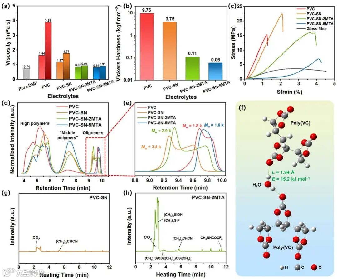 图3. 原位固化电解质的粘度(a)、硬度(b)、应力应变性能(c)、GPC测试(d, e)。(f)水分子与聚合物链形成氢键示意图。(g, h)不同电解质的GC-MS测试结果。