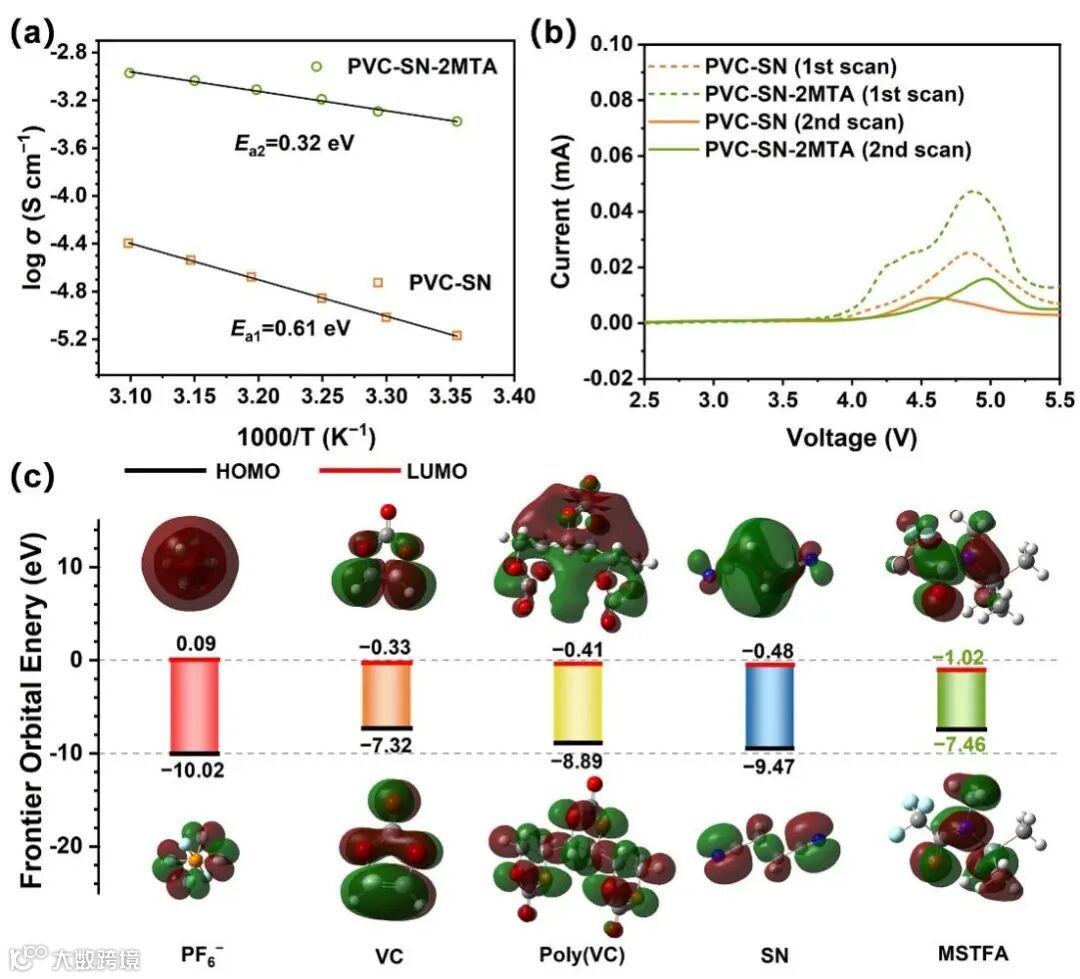 图4. 原位固化电解质的离子电导率随温度变化(a)、LSV对比(b)及电解质中包含的不同分子的HOMO/LUMO计算(c)。
