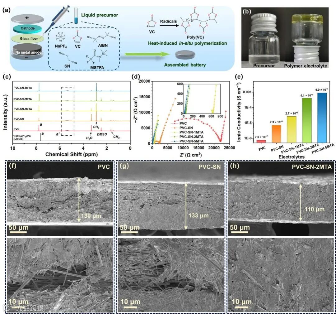 图2. 原位固化电解质的制备过程(a)、前驱液固化前后对比(b)、NMR测试(c)、离子电导率测试(d, e)及固化后横截面SEM对比(f–h)。