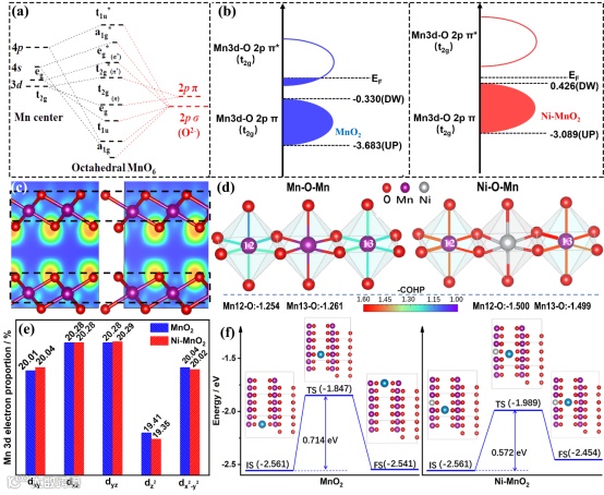 为了阐明这些电化学性能增强的来源,根据价带理论以及密度泛函理论(DFT)计算,揭示了Ni-O-Mn桥接构型对Ni-MnO2电子和晶体结构的影响。计算结果从分子轨道的角度强有力地验证了增强的π‑donation效应对于过渡金属氧化物稳定性和动力学的增强的作用机制。