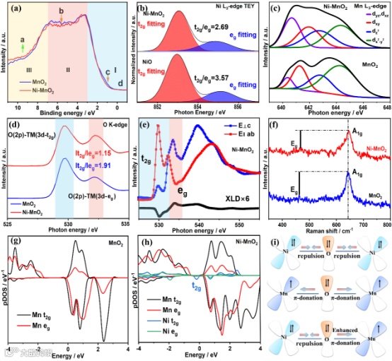 本文通过XPS价带谱、sXAS、XLD等实验表征手段及理论计算,深入分析了增强的π‑donation效应形成的具象化的表现形式。在构建的Ni-O-Mn桥接构型中电子从Ni t2g轨道转移到Mn t2g轨道,从而增强了O2p轨道和Mn 3d轨道之间的杂化。并且用(i)中的示意图形象地表示了增强的π‑donation效应。