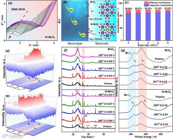 电化学实验及多温度阻抗结果表明,具有Ni-O-Mn桥接构型的Ni-MnO2具有更高的比容量以及更优异的动力学性能。结合原位拉曼测试,类原位XRD测试,类原位sXAS测试深入探究了其结构演化,并对其稳定性进行了评估,这证实了Ni-MnO2材料不仅能够增强电荷转移,还能够提高循环稳定性,为进一步开发高性能电极材料提供了可靠的基础。