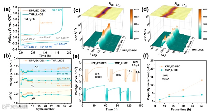 作者通过恒电位(4.5 V)腐蚀测试进一步评估不同电解液的电化学稳定窗口以及铝箔作为正极集流体的可行性(图2d)。铝箔在充电高压条件下易被氧化生成三价的Al3+,具有Lewis酸性的Al3+可以和有Lewis碱性的盐阴离子(如FSI-)结合生成[Al(FSI)x]3-x,并被TMP_LCE中大量存在的自由溶剂所络合,导致铝箔正极集流体在高压条件下持续被腐蚀(图2e)。而得益于溶剂化结构中显著减少的自由溶剂数目,作者设计的TMP_LHCE可显著抑制被氧化的铝离子向电解液中的溶解趋势(图2f),因而表现出较低的腐蚀电流,且经氧化测试后铝箔表面未见明显腐蚀迹象。此外,作者还观察到钾/铝半电池的界面电荷转移动力学在TMP_LHCE电解液中表现出一个自活化过程,即初始首圈的形核电位、形核过电位及沉积-剥离过电位均大于使用传统碳酸酯类电解液(KPF6/EC-DEC)(图3a),而经过一定循环周次后,以上(过)电位的绝对值均明显降低(图3b)。鉴于此,作者对前2圈金属钾在铝箔基底上的沉积-剥离行为进行了原位电化学阻抗谱测试,并进行了弛豫时间分布(DRT)分析。