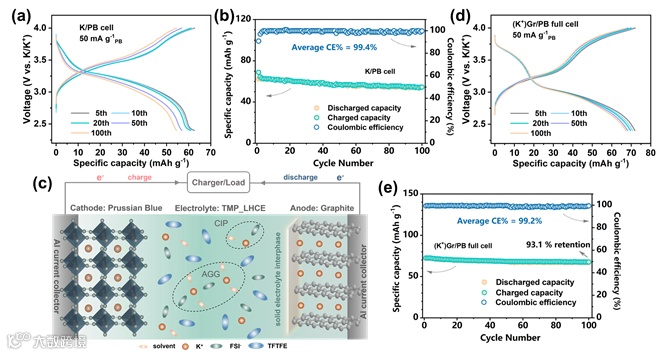 图6. 以铝箔为正负极集流体的钾离子全电池电化学性能表征。(a-b)钾/普鲁士蓝和(d-e)嵌钾石墨/普鲁士蓝钾离子全电池在所设计的阻燃LHCE电解液体系中的特征充放电曲线、可逆循环容量和效率比较;(c)以嵌钾石墨为负极,普鲁士蓝为正极、铝箔为正负极集流体、阻燃LHCE为电解液的“摇椅式”钾离子全电池工作原理示意图。