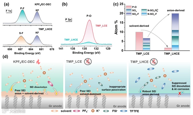 XPS测试用于表征不同电解液循环后在石墨负极表面生成的SEI组分,其中在KPF6/EC-DEC体系中循环后的石墨电极上可以观察到大量由盐和溶剂共同分解后的-C=O-, -O-C=O-, POxFy, P-F, 和 KF组分(图5a),而区别于TMP_LCE中高强度、由TMP溶剂分解导致的P-O组分信号,TMP_LHCE中的P-O组分信号则十分微弱(图5b),且还观察到了大量由FSI-盐阴离子分解产生的组分(图5c),这表明在阻燃TMP基LHCE电解液中,石墨负极表面主要为阴离子分解参与构建的SEI(图5d),这与前面的CV数据分析、溶剂化结构分析以及模拟计算结果相吻合。