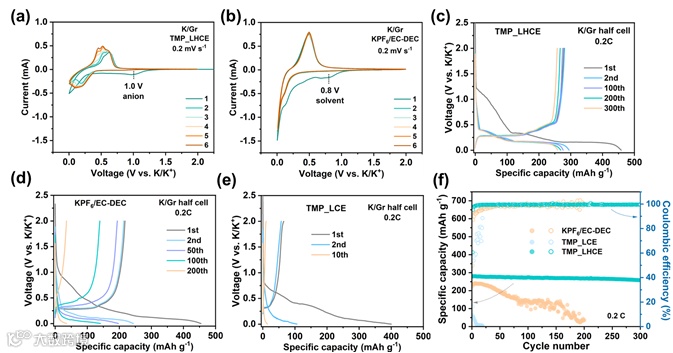 图4. 不同电解液中以铝箔基底作为集流体的石墨负极储钾循环可逆性比较。钾/石墨半电池在(a)所设计的TMP_LHCE和(b)传统碳酸酯类电解液中的循环伏安曲线比较;钾/石墨半电池在(c)TMP_LHCE,(d)0.8M KPF6/EC-DEC和(e)TMP_LCE电解液中特征充放电电压曲线和(f)石墨长程储钾稳定性比较。