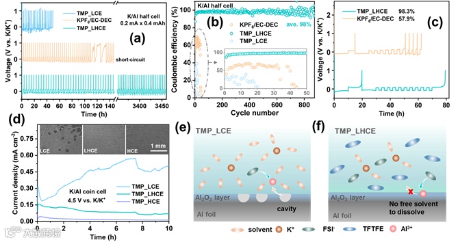 图2. 不同电解液中铝箔基底作为钾金属沉积宿主循环效率以及正极集流体抗高压氧化性能比较。(a)不同电解液中金属钾在铝箔基底的沉积-剥离行为及(b)相应的库伦循环效率和(c)Aurbach效率比较;(d)4.5 V恒电位条件下铝箔基底的阳极氧化曲线及循环后铝箔的SEM图(d插图);铝箔在(e)LCE电解液中的腐蚀示意图以及在(f)LHCE中的腐蚀抑制机理示意图。