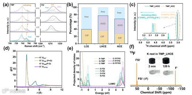 图1. 电解液的溶剂化结构表征。(a)TMP溶剂和FSI-阴离子在低浓电解液TMP_LCE (1.0 M KFSI/TMP),高浓电解液TMP_HCE (4.20 m KFSI/TMP)和局部高浓电解液TMP_LHCE的Raman图谱;(b)各种电解液中与FSI-相关的物种(包括自由阴离子、接触离子对和团聚体)占比的统计柱状图;(c)TMP_HCE以及TMP_LHCE体系里TMP溶剂中-CH3的1H NMR图谱比较;(d)LHCE中K+和临近O原子的径向分布函数;(e)LHCE中不同组分的原子投影态密度比较;(f)K金属在LHCE电解液中久置后的副产物19F NMR图谱。