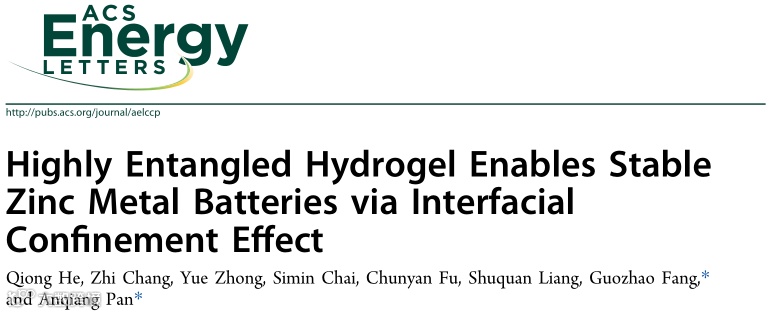 近日,中南大学、新疆大学的潘安强教授与中南大学的方国赵教授合作在国际知名期刊ACS Energy Letters上发表题为“Highly Entangled Hydrogel Enables Stable Zinc Metal Batteries via Interfacial Confinement Effect”研究论文。该文章通过优化高缠连弹性链的可逆构象,解决了刚度-韧性冲突,打破了离子电导率和机械强度之间的权衡,实现了显著的机械性能(446 kPa拉伸强度)和高离子电导率(3.93 mS cm-1)。此外,在高缠连水凝胶的限域效应下靶向调控界面电化学行为,在负极表面获得动态稳定的非枝晶平面形态。因此,采用这种电解质的锌负极在0.5 mA cm-2下表现出6000 h的长期循环稳定性,在68.4%的放电深度下循环超过220 h。这项工作为实用的高性能耐磨锌锰电池提供了重要的先进技术手段。